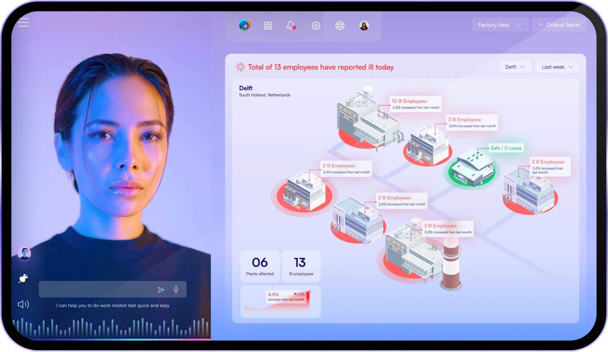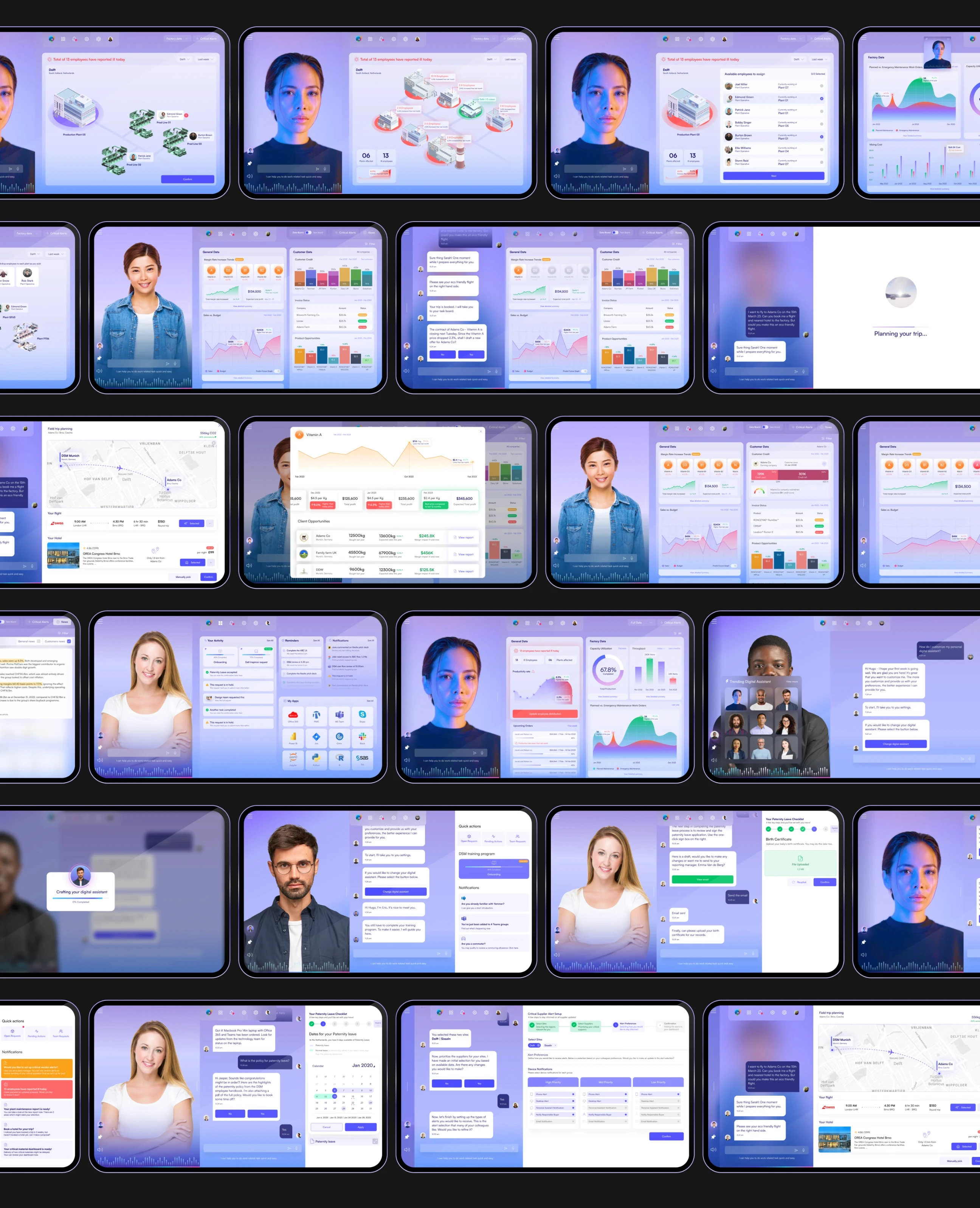DSM is a multinational corporation specializing in nutrition, health, and beauty. They were exploring ways to implement AI into their employee workflows to maximize productivity and reduce human error. I was tasked with designing a futuristic digital assistant to help DSM's employees work smarter and more efficiently.