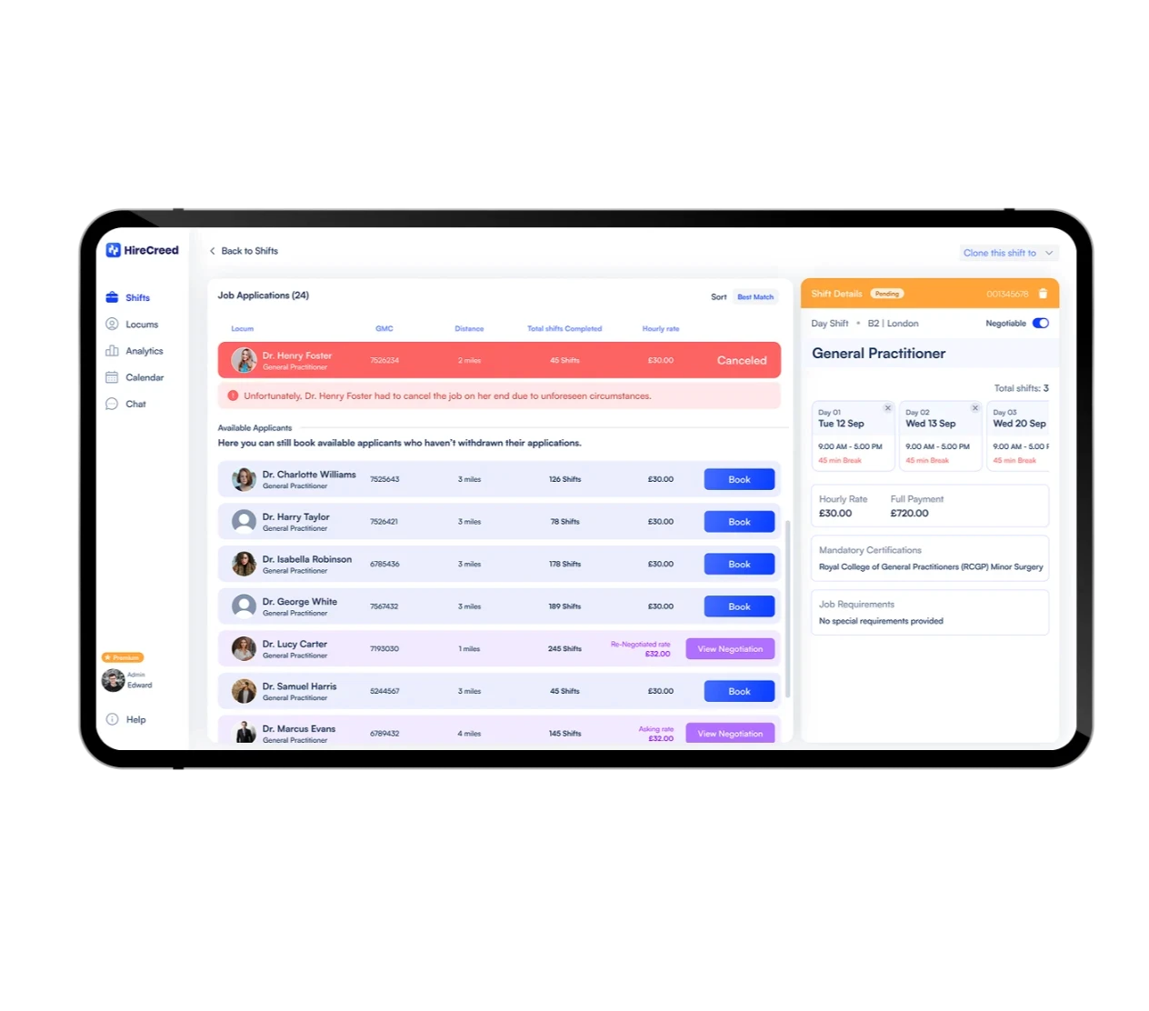 Prototype for negotiating or re-negotiating shift rates between locums and businesses through the HireCreed application.
