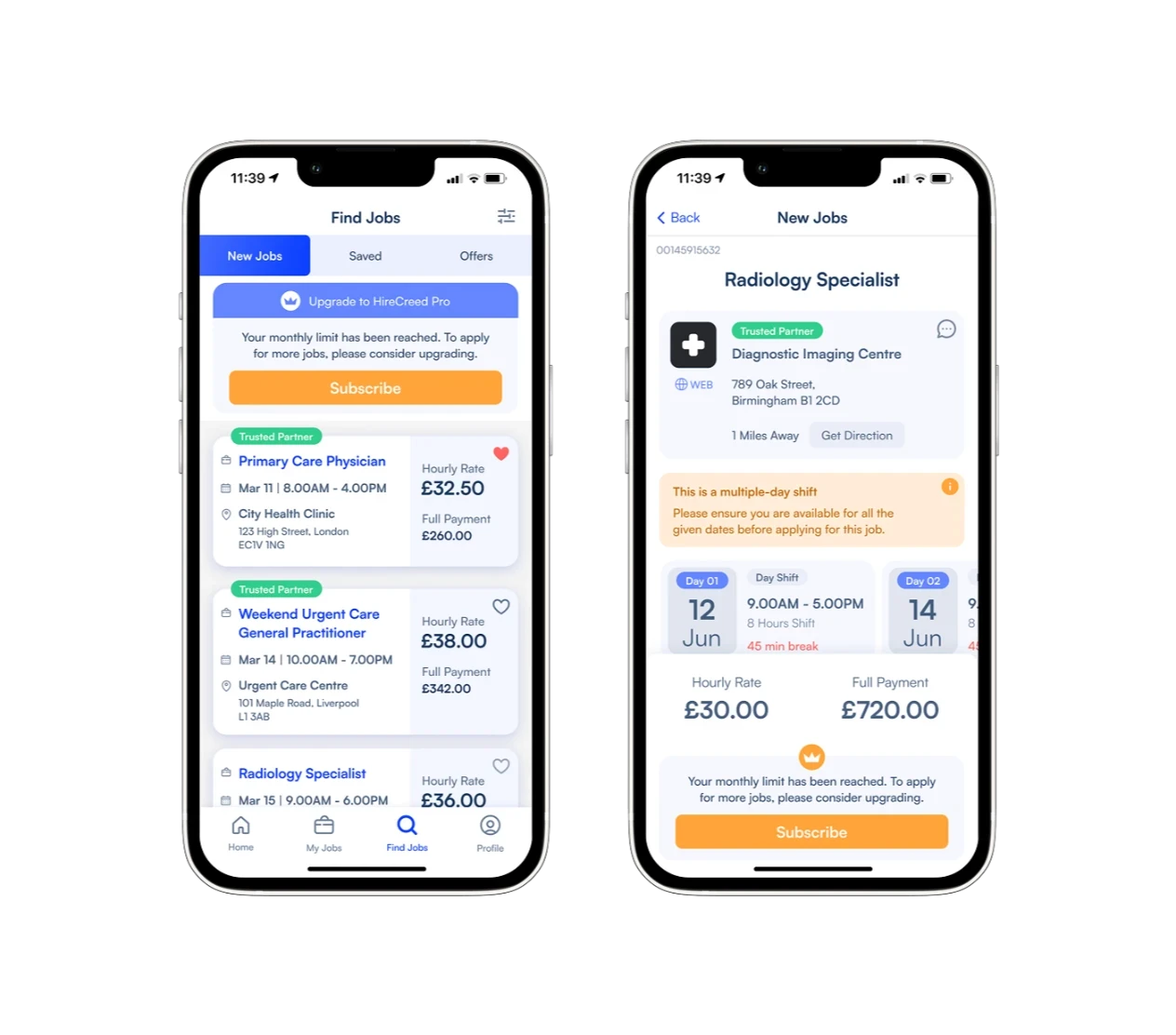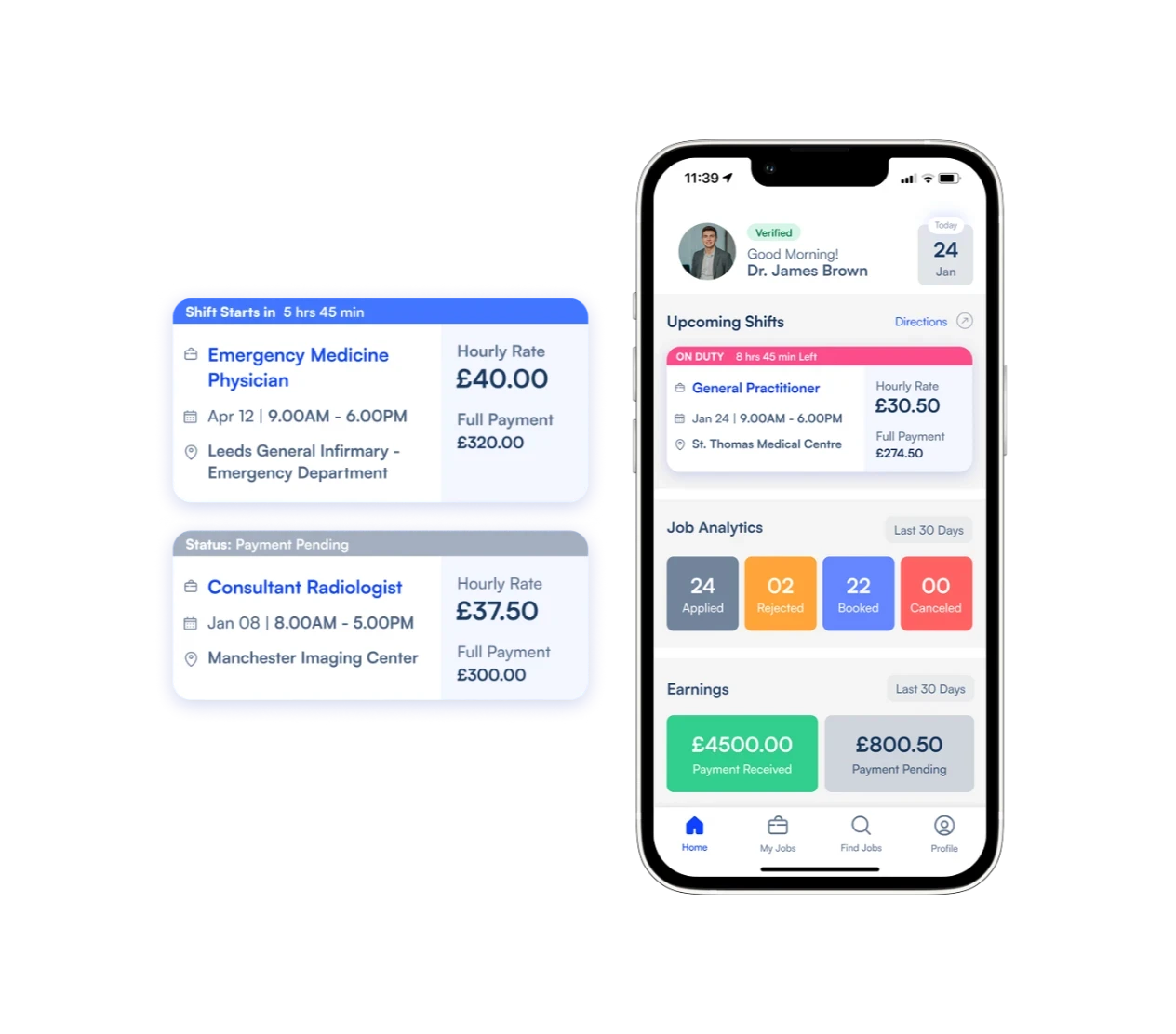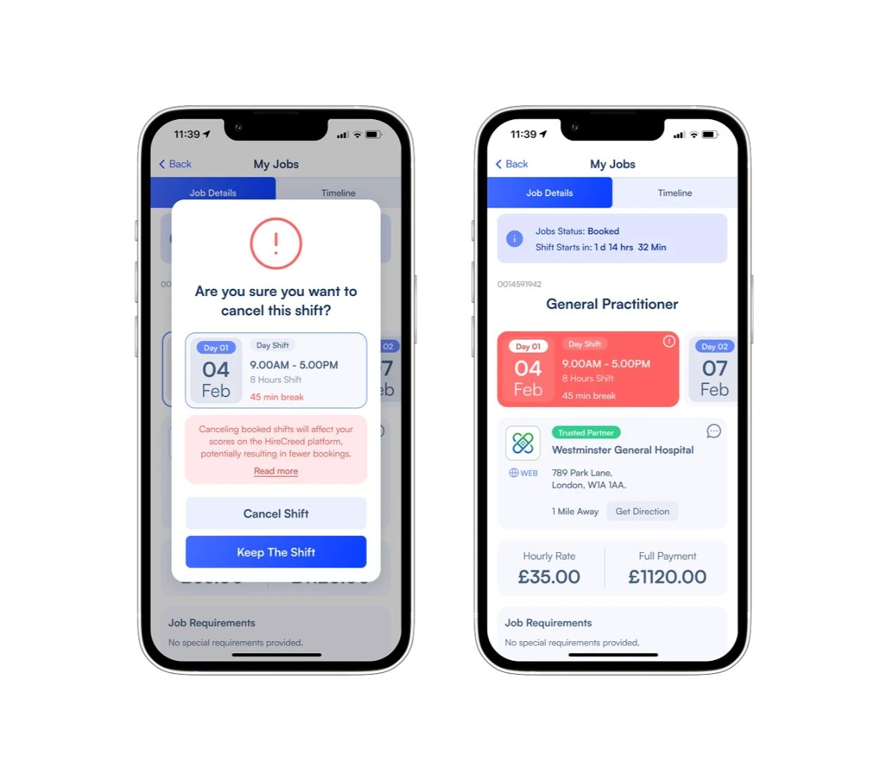 In "Find Jobs," users can explore and find jobs easily, with the option to save favorite shifts and find any personal offers sent to them. In "My Jobs," users can view all applied and booked jobs. Color status is added to easily filter the status of the shift.