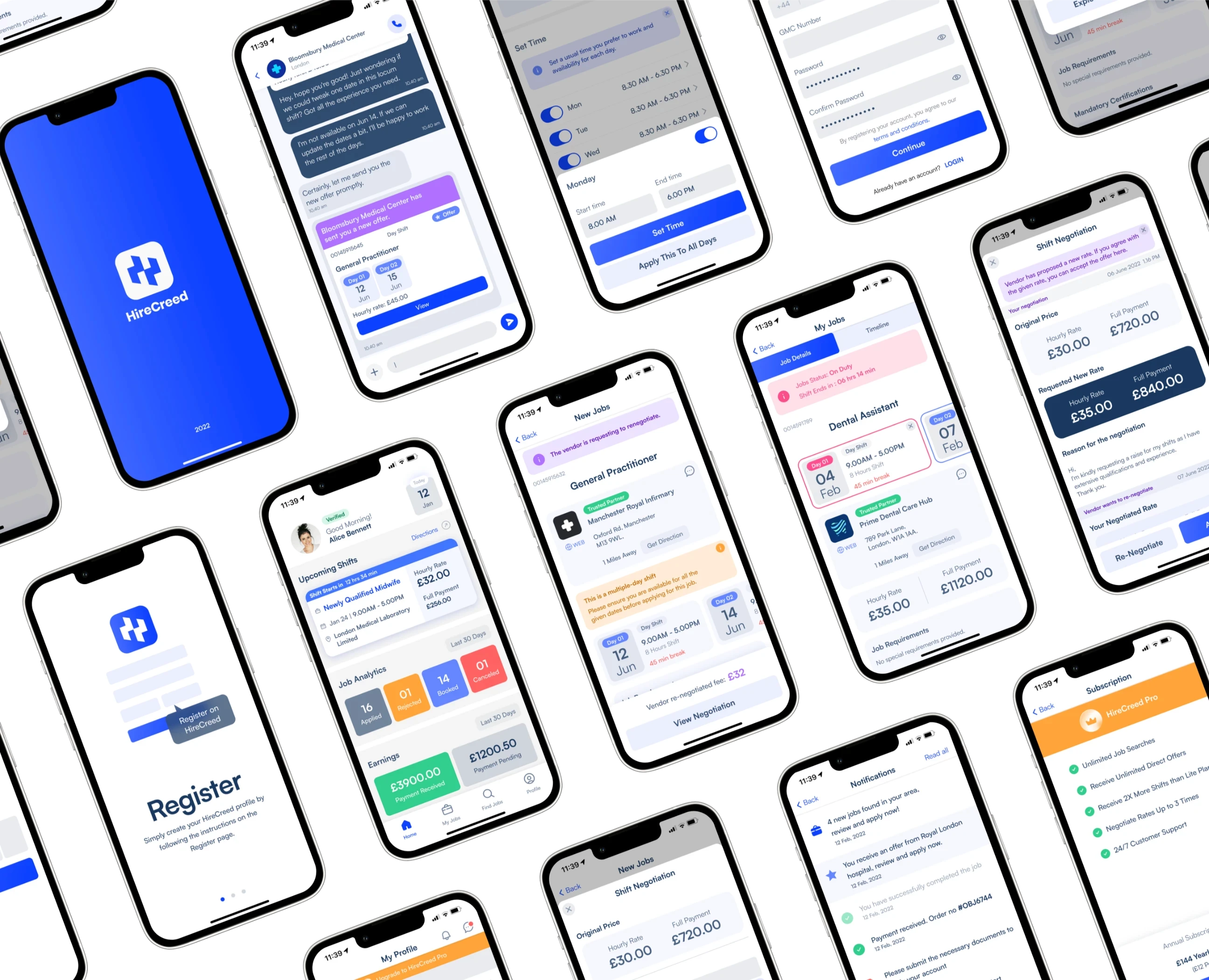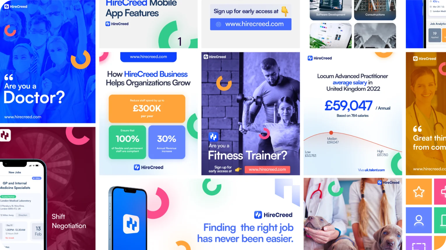 For HireCreed's branding identity, I worked on concepts that reflected our modern approach as a next-gen locum platform. The goal was to convey a contemporary vibe that resonated with today's era. It was about using visuals, colors, and messaging that captured HireCreed's innovative and forward-thinking nature.