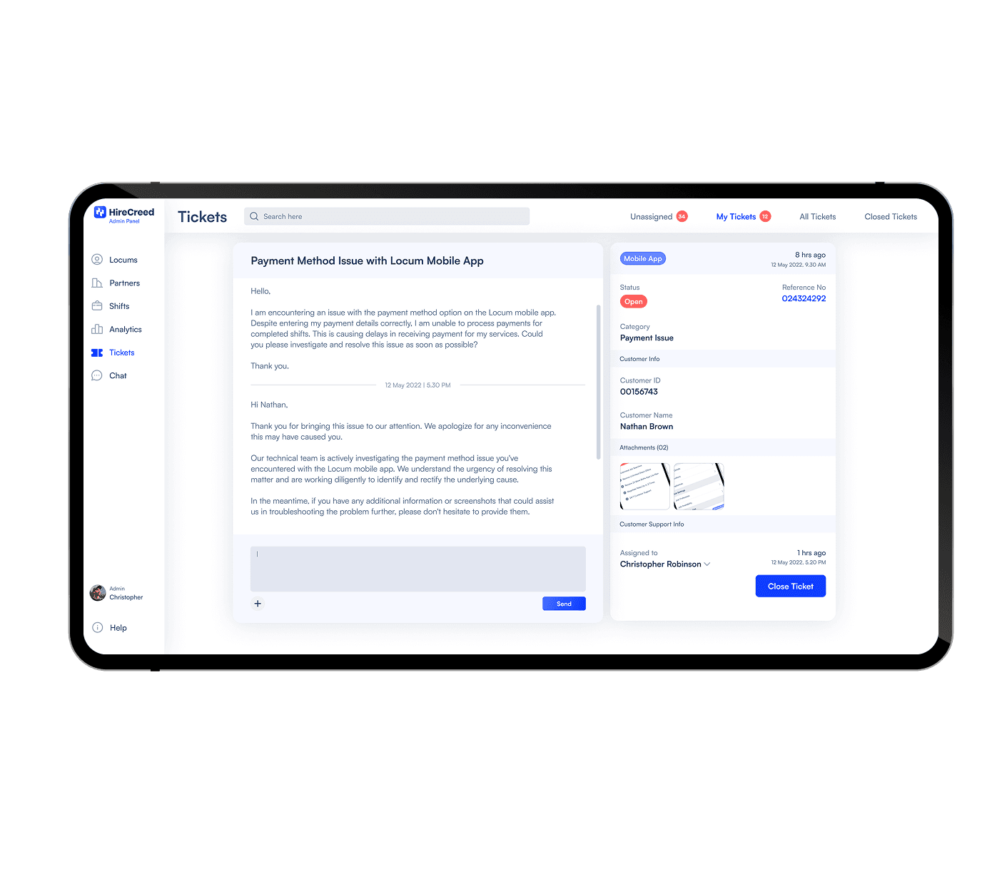 A simple yet smart ticketing system is designed for customer support. Both the locum mobile app and business application have the option to submit tickets. Then HireCreed customer service team can easily view and offer assistance through this efficient ticketing system.