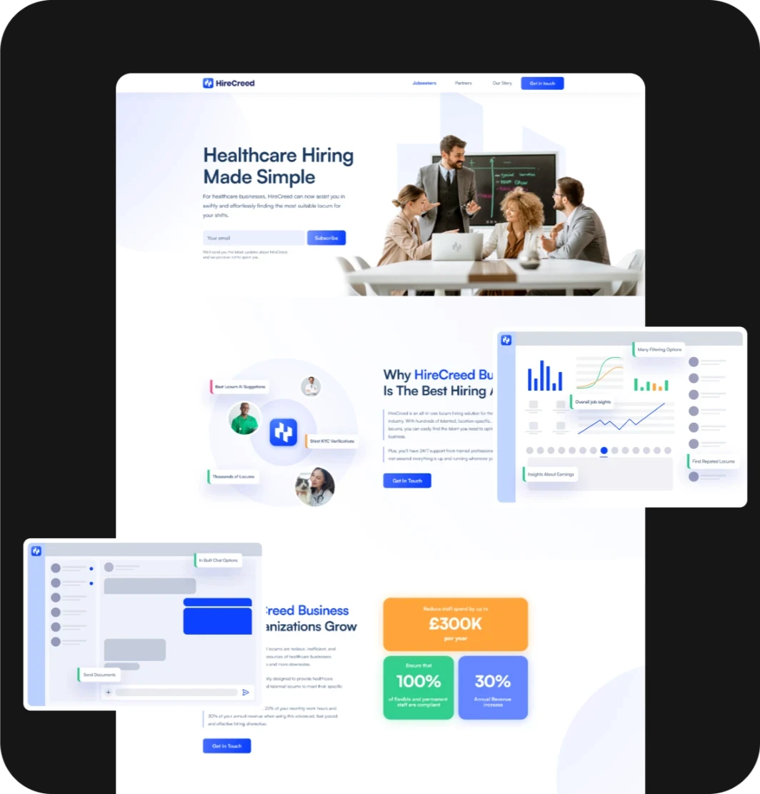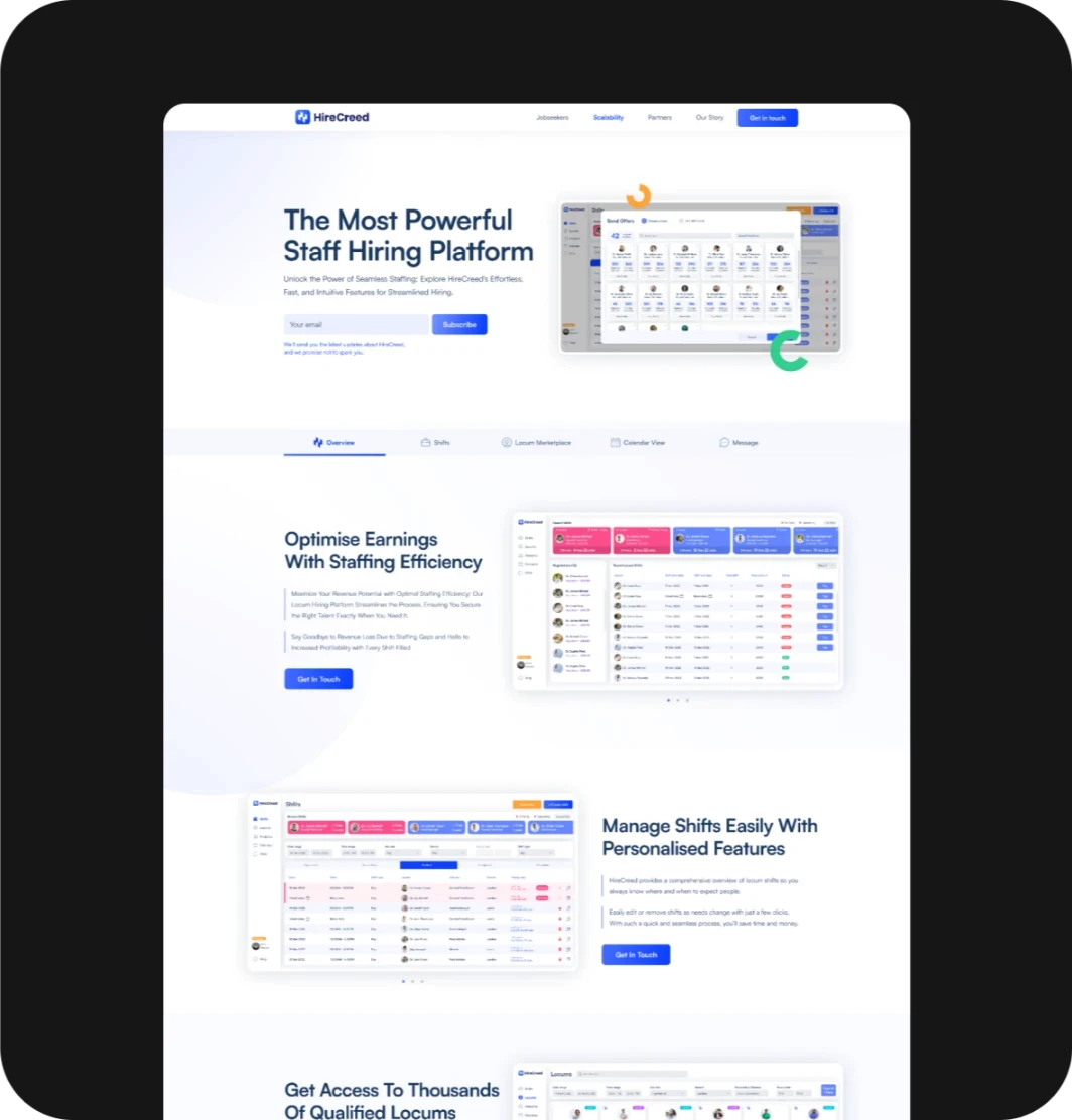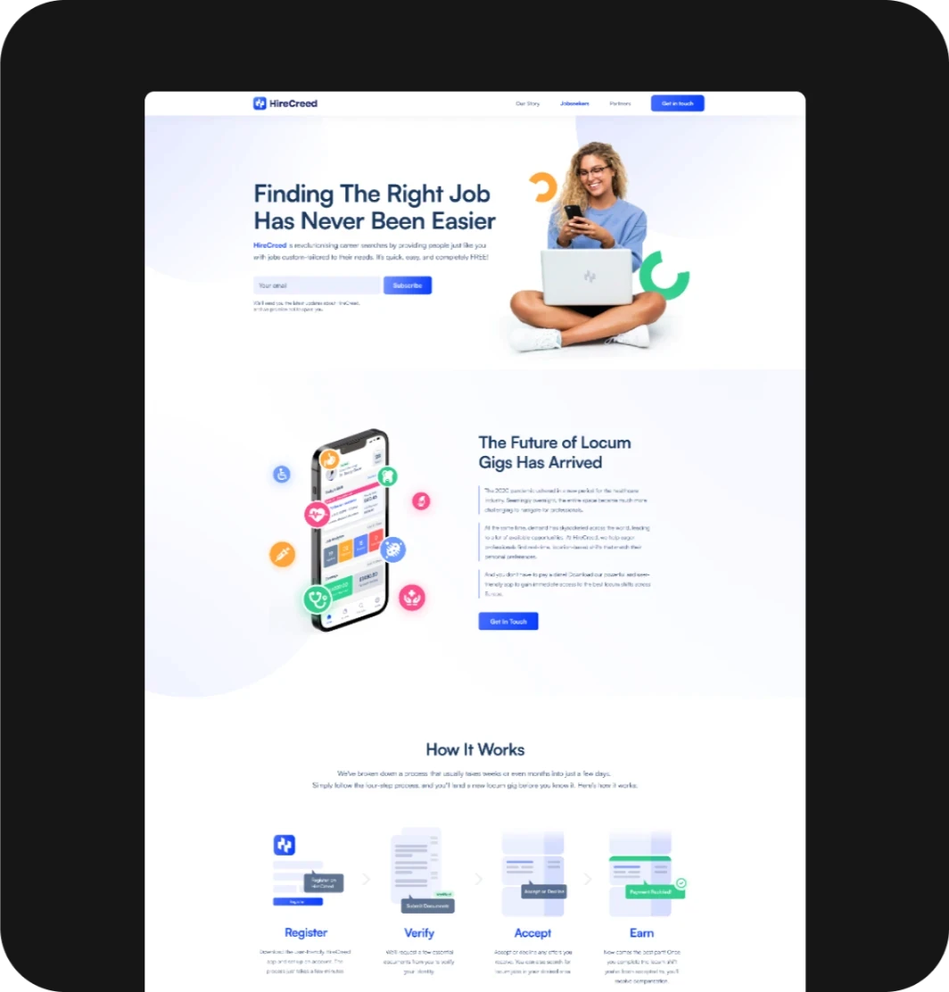 The HireCreed website reflects a modern, vibrant brand with a professional touch. Its clean, light theme aligns with our branding strategy, highlighting the mobile app’s features to attract locums and generate leads.