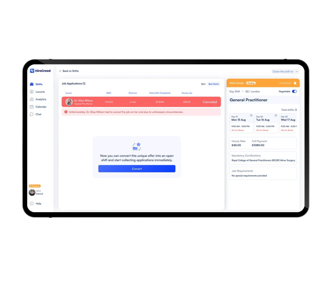If a personalized offer gets canceled, users can convert it into a regular shift with just one click, releasing it to the locum market. Additionally, there's an option to duplicate any shift, retaining the same information, and users can edit the data before releasing it to the market.