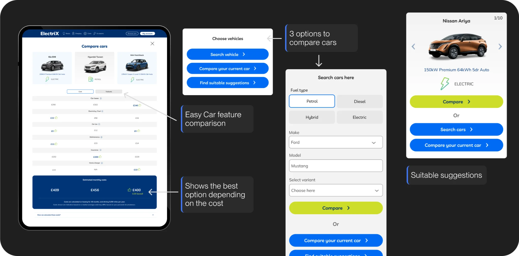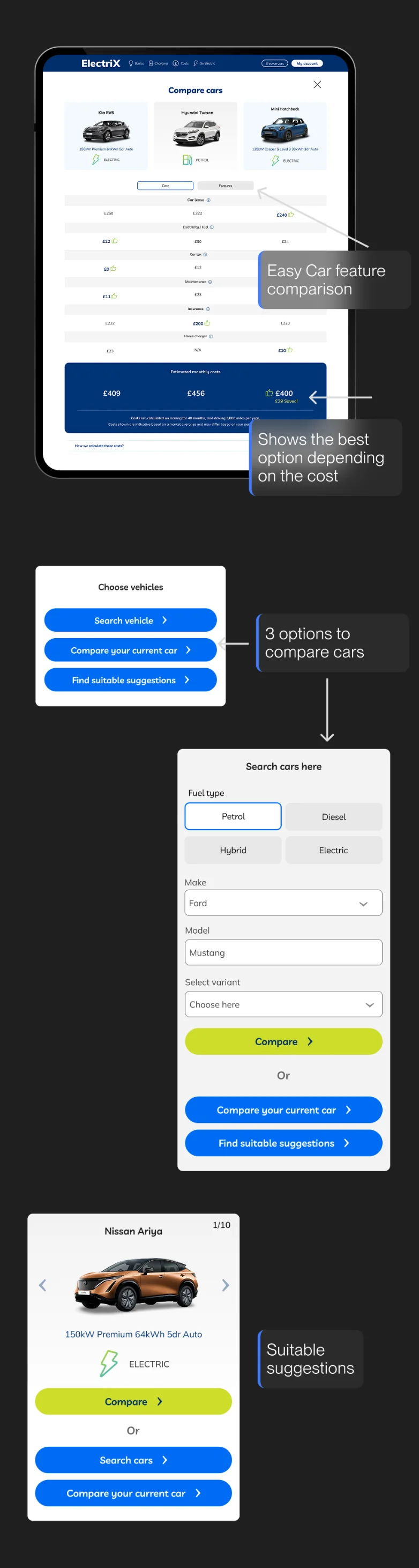A new compare filter has been included, allowing users to compare up to three vehicles at once. This enables users to test EVs against EVs, EVs against fuel-based vehicles, and vice versa.