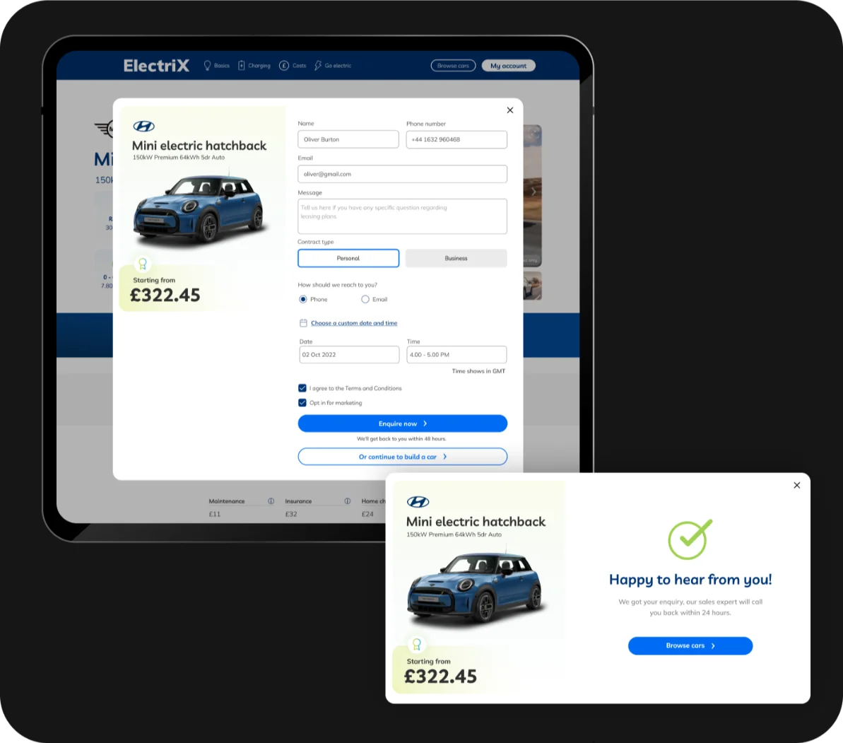 This solution serves a key purpose: If a customer is browsing for an electric car and wishes to learn more about a particular model before starting an application, "Enquire Now" offers them the opportunity to do so. When a customer representative reaches out, they can provide further details about the car the customer is interested in.