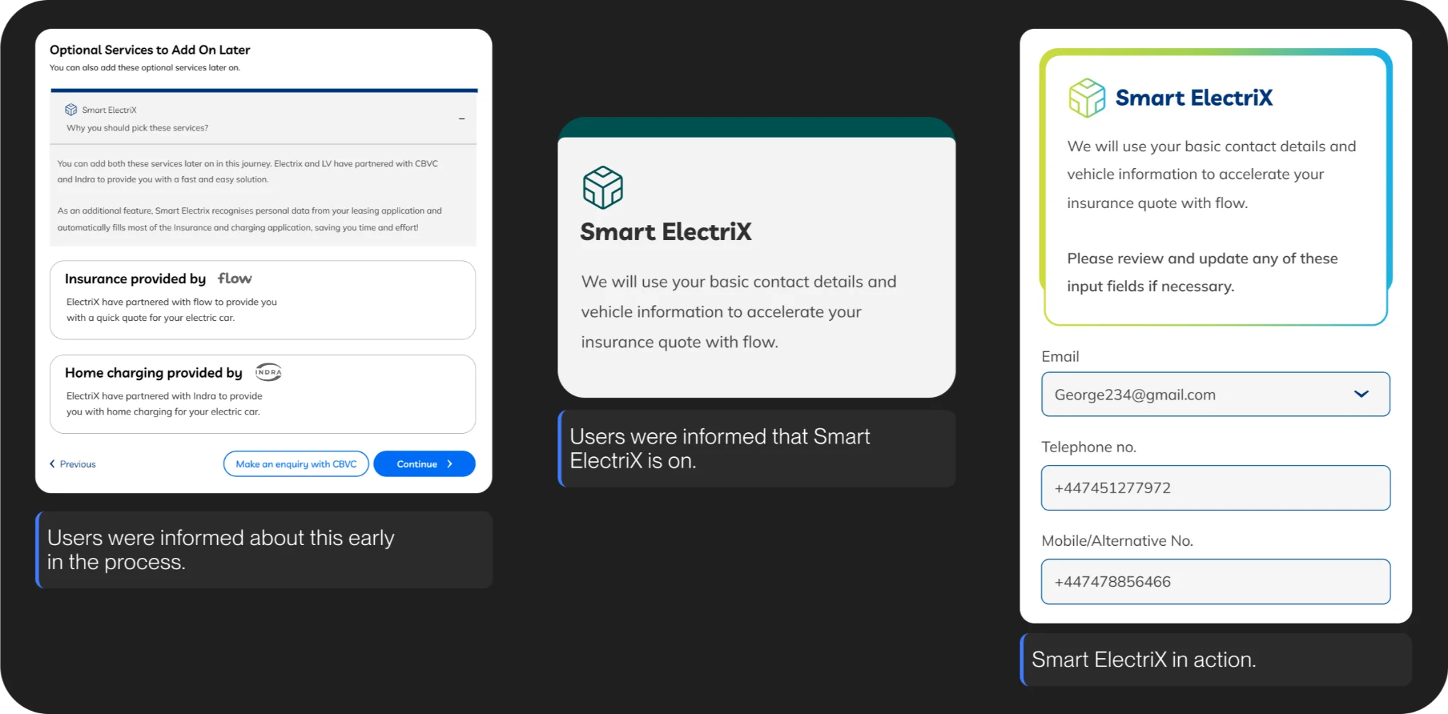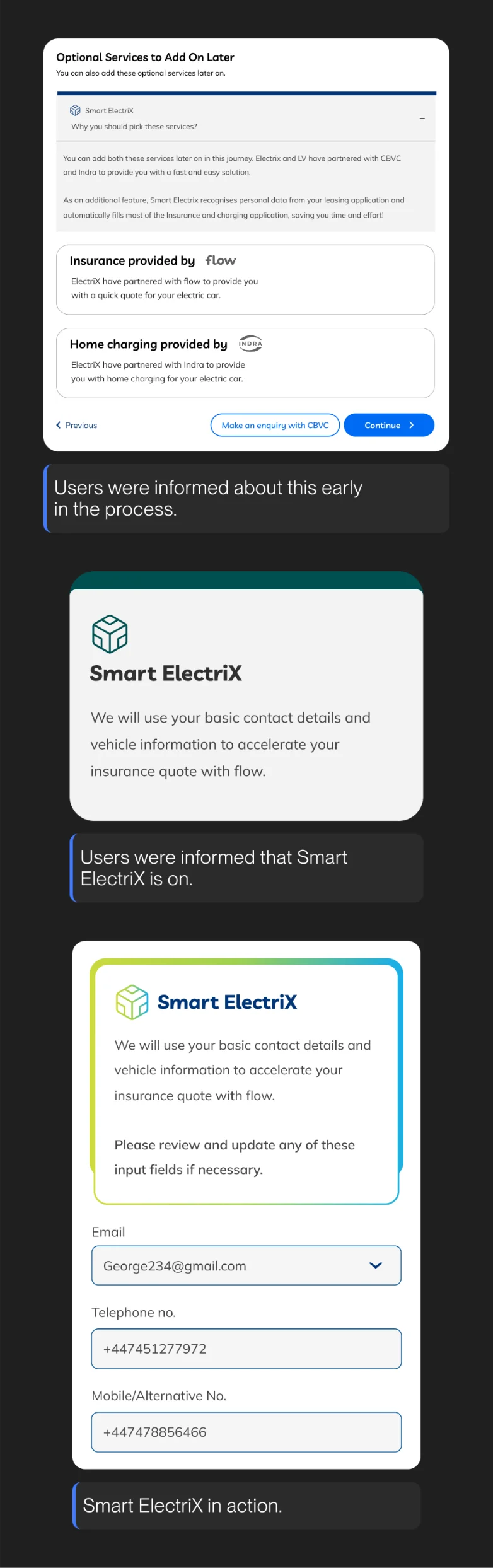 For example, some of the information on insurance applications would be automatically filled by Smart Electix since the user already entered them in the leasing flow.