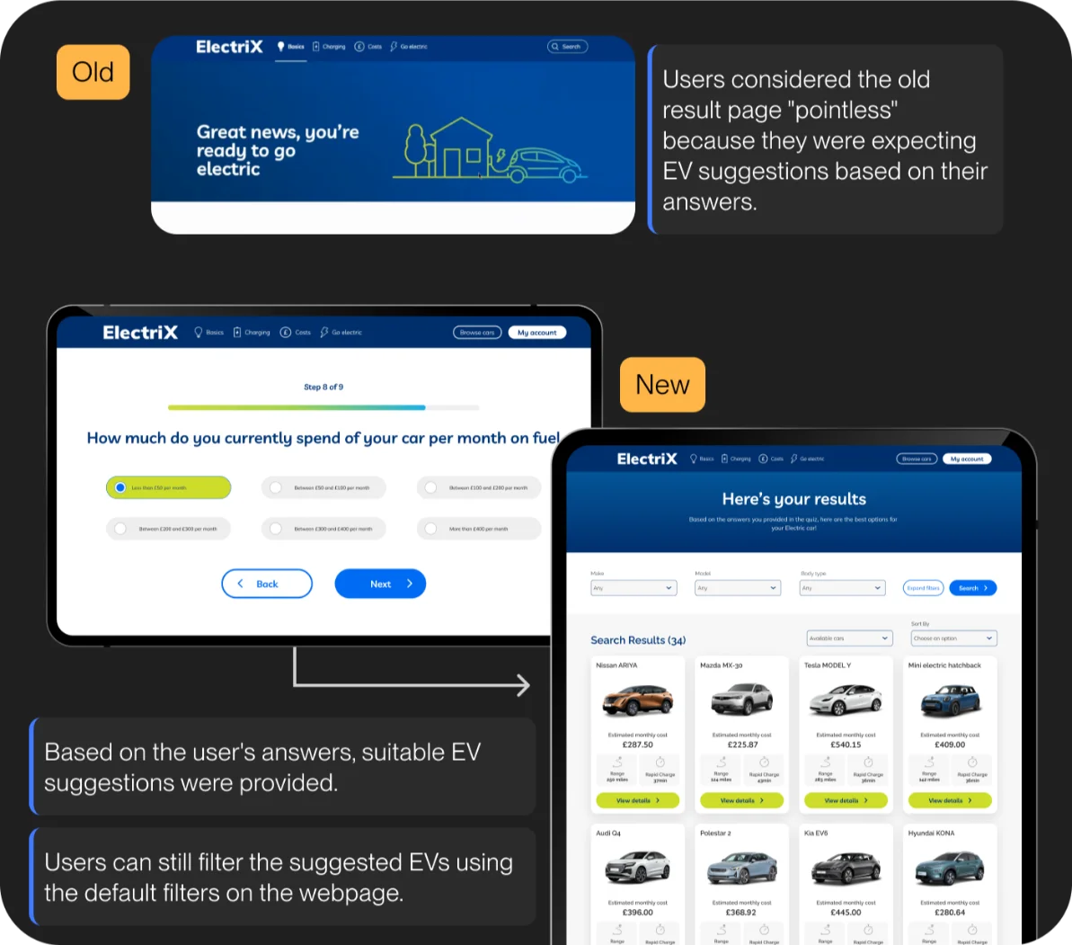 Early lifestyle quizzes didn’t resonate well with users, as the results often felt irrelevant. To address this, the car results page was redesigned to better match users' answers, creating a more personalized experience. This also serves as a first step toward the leasing application for those interested.