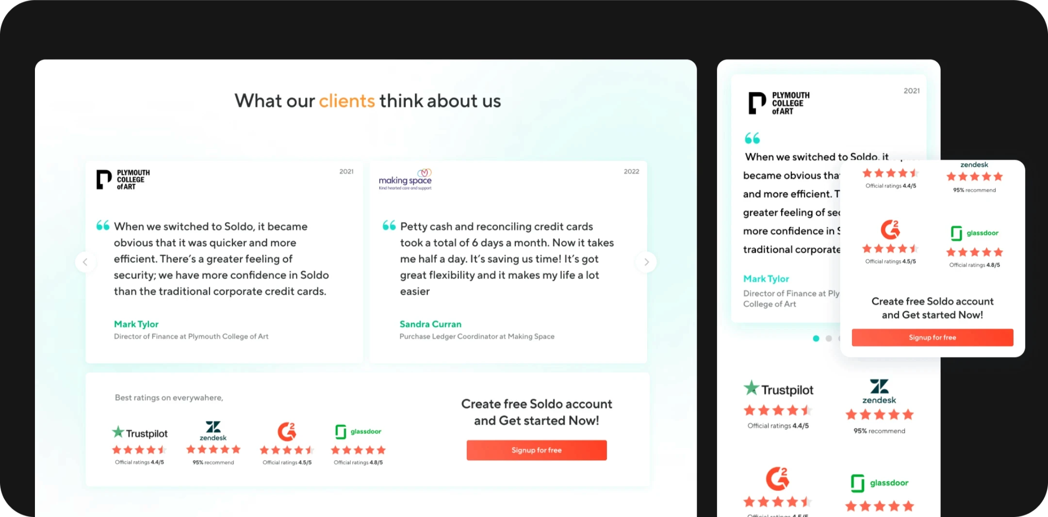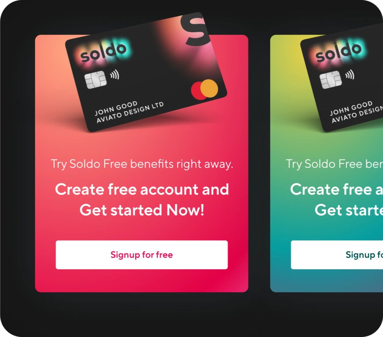 I experimented with various banner models to capture user attention at first glance while keeping Soldo’s branding intact. Instead of a regular layout, I used bold graphics that highlighted Soldo cards. Every banner design was tested across all device sizes to ensure maximum engagement.